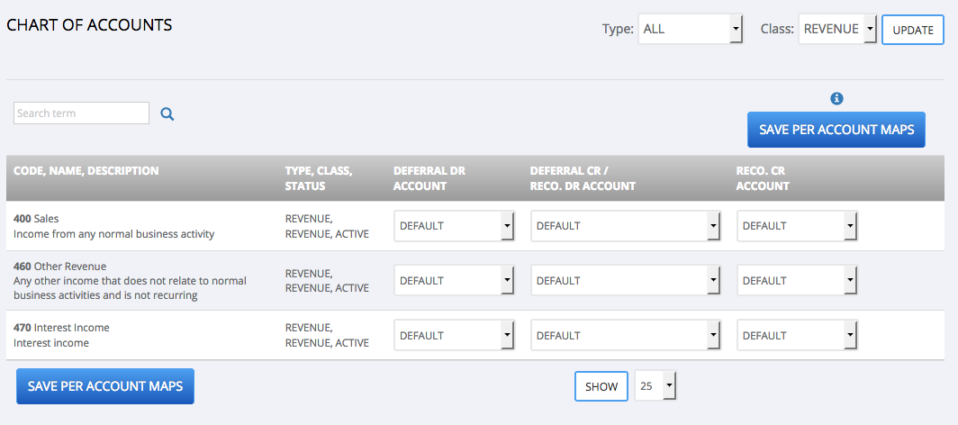 - choose "REVENUE" in the Class filter in the "Chart of Accounts" panel, then click "update".