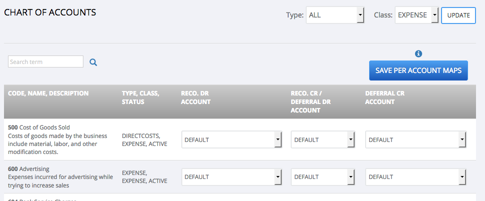 For EXPENSE accounts, select class "EXPENSE" and update. You can then specify the advanced maps for expense accounts too.